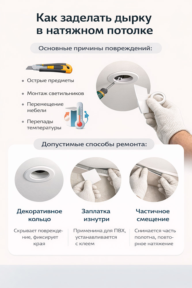 Натяжные потолки широко применяются в жилых и коммерческих помещениях благодаря ровной поверхности, влагостойкости и длительному сроку службы. Однако полотно остаётся уязвимым к механическим повреждениям. Даже небольшая дырка или порез способны нарушить натяжение и привести к дальнейшему разрушению материала, поэтому вопрос корректного ремонта требует точной оценки и соблюдения технологических ограничений.